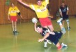 Anschluss an die obere Tabellenhälfte zu verlieren. Es war nicht das erwartet heiß umkämpfte, stimmungsgeladene Derby in der Fuldaer Gellingshalle. Zum einen, weil von den lediglich 100 Zuschauern die meisten als neutrale Beobachter gekommen waren und somit die Stimmung in der Halle eher der auf einer Beerdigung glich, zum anderen, weil die beiden Mannschaften besonders auf spielerischer Ebene einiges schuldig blieben. Schlüchtern erwischte den besseren Start und ging nach einer Viertelstunde bereits mit 5:1 Front. Dies lag neben der starken Schlüchterner 6-0-Deckung besonders an Routinier Harald Ullrich, der die Lücken in der offensiv ausgerichteten Fuldaer Deckung mit ihrem weit Vorgezogenen Thomas Okrusch zu nutzen wusste und in dieser Phase zu zwei seiner insgesamt vier Treffer kam. Fulda enttäuschte im Angriff auf der ganzen Linie. In der Anfangsviertelstunde konnte man lediglich einen Treffer durch Grigoras verzeichnen, die sonstige Fuldaer Offensivleistung beschränkte sich auf technische Fehler und eklatante Schwächen im Abschluss. Symptomatisch für die Missstände im Spielaufbau der Gastgeber war die Tatsache, dass es der Turnerschaft selbst in dreifacher Überzahl nicht gelang, das Leder im Schlüchterner Tor unterzubringen. Torhüter Volker Wingenfeld hatte FT es zu verdanken, dass man bis zur Pause noch einmal auf 7:8 herankommen konnte. Allerdings ließ auch er nach der Pause nach. Überragender Mann auf dem Parkett war seine Schlüchterner Pendant Cosmin Popa. Der Rumäne steigerte sich im zweiten Spielabschnitt zur Höchstform, strahlte Souveränität aus und dirigierte seine Deckung, die Fuldas Rückraumspieler Jürgen Kapitz und Daniel Flamme nicht zum Zuge kommen ließ und deren Würfe wiederholt blockte. Dennoch kam FT zu einigen guten Tormöglichkeiten, da der Angriff der Gäste im Gegensatz zur Deckung viel Sand im Getriebe hatte und die Domstädter zu Gegenstößen einlud. Doch egal ob Linksaußen Christian Braun, Rechtsaußen Sadri Syla oder Kreisläufer Thomas Okrusch völlig frei aufs Schlüchterner Tor warfen, oder ob die Fuldaer Schützen sich vom Siebenmeterpunkt aus versuchten – Popa stand immer goldrichtig und blieb in nahezu allen Duellen Sieger. Mit zunehmender Spieldauer zog er den Fuldaer Angreifern mehr und mehr den Zahn und konnte sich einen großen Anteil des Schlüchterner Erfolgs auf seine Fahnen schreiben. FT Fulda: Wingenfeld (1.-60.), Krause; Braun, Kapitz (1), Burmann (1), Flamme, Syla (1), Okrusch (1), Fritz (5/1), Grigoras (4), Dittrich. Schlüchtern: Popa (1.-60.), Gyöngyösi; Grimm (1), Masztalerz (2), Otto (4/1), Schmidt (3), Müller (1), Ullrich (4), Scholz, Krafft, Stumpf, Orth (2). Schiedsrichter: Arlt/Tafferner (Nieder-Eschbach). Zuschauer: 100. Beste Spieler: geschlossene Mannschaftsleistung – Popa. Rote Karte: Marc Schmidt (39. nach Tätlichkeit). FZ |