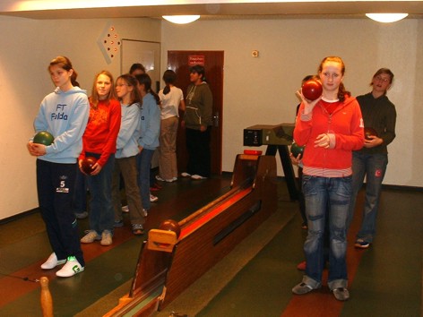 Uhr zum Kegeln getroffen. Wir waren 14 Mädchen, die bei jeder Menge